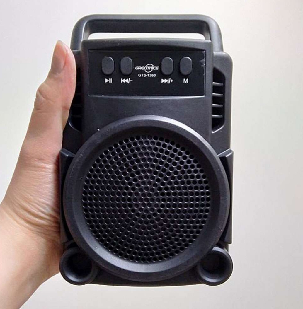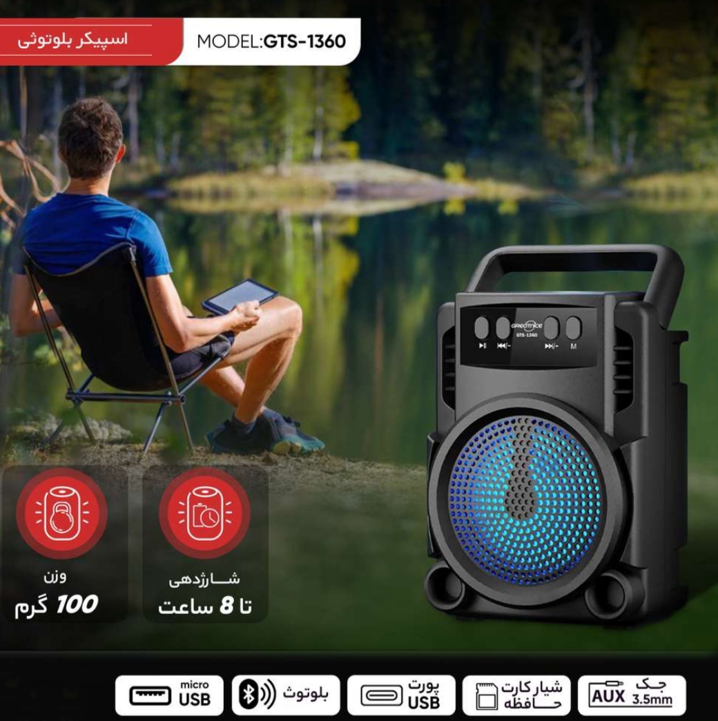 اسپیکر بلوتوثی قابل حمل GTS مدل 1360، مدت زمان پخش 8 ساعت نسخه بلوتوث 5 منبع انرژی باتری مدت زمان شارژ شدن 1 ساعت، همراه با کابل ،شارژ دارای درگاه USB و ورودی کارت حافظه دارای رقص نور میکروفون داخلی و پشتیبانی از رادیو