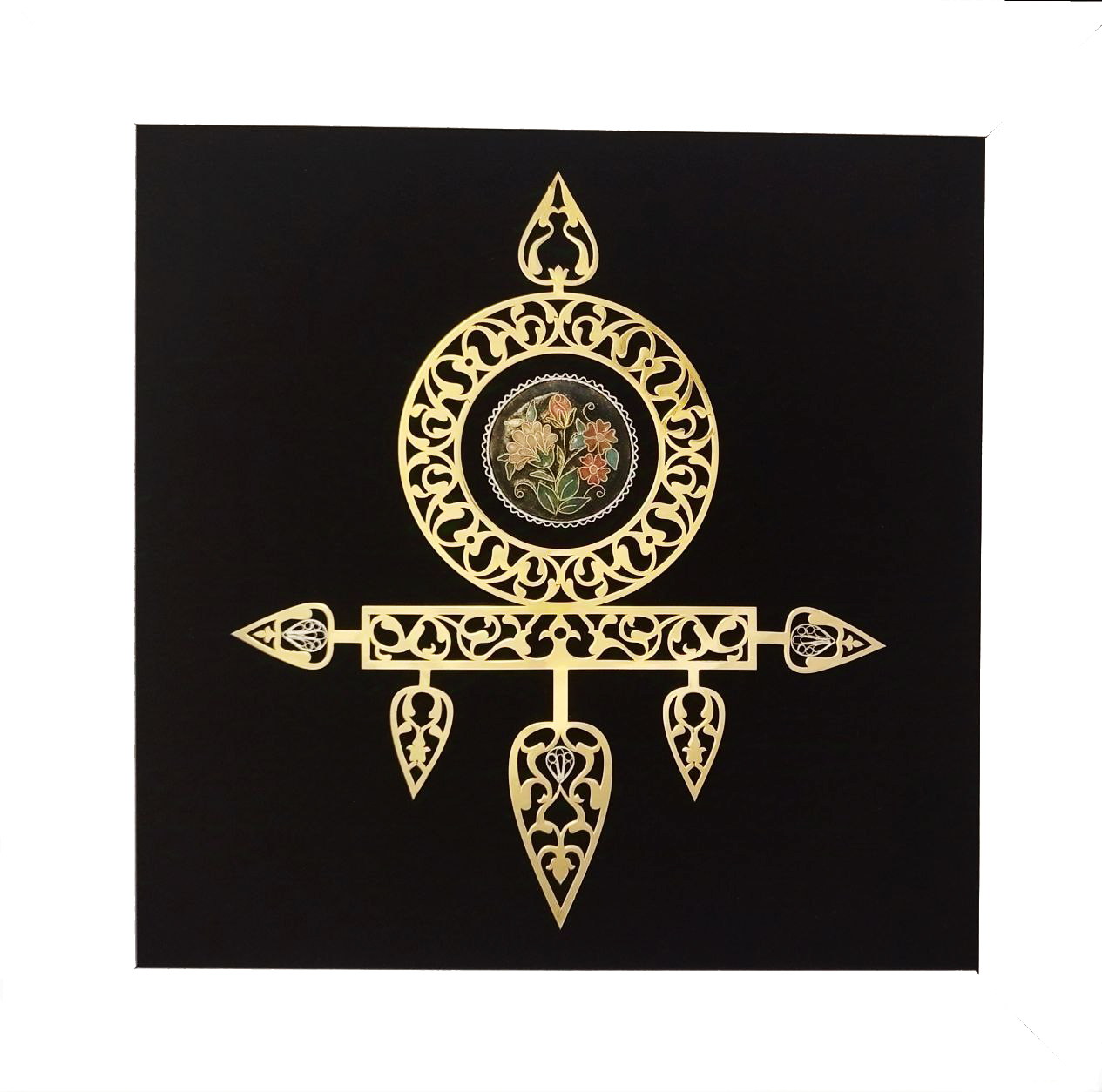 تلفیق هنرهای مشبک کاری،ملیله کاری و مینای خانه بندی متریال مصرفی: فلز برنج (قسمت مشبک کاری) فلز نقره 99 درصد (قسمت ملیله کاری) س زمینه پارچه مخمل مشکی قاب پروفیلی سفید رنگ به ابعاد قاب28*28 تابلوی علم و سرو ، طرحی جذاب برگرفته از طرح سرو ایرانی در فرم های اسطوره ای و نقوش گیاهی است که از تلفیق هنرهای رو به فراموشی ایران ساخته شده . هنر زیبای خانه بندی که از فرم دهی مفتولهای ظریف برنجی و رنگهای و لعابهای خاص در مرکز این تابلوی زیبا خودنمایی می کند ، هنری رو به فراموشی است .ترکیب فلز برنج و فلز نقره و هنر زیبای خانه بندی با رنگهای جذاب کوره پخت ،در پس زمینه مشکی مخملی ،تصویری بی نظیر خلق کرده که نگاه هر بیننده ای را به خودش جلب می کند. این تابلوی بی نظیر مناسب هر خانه و محل کار می باشد و هدیه ای بی نظیر برای عزیزان و همکاران و مدیران ارشد سازمانی است. و البته هدیه ای ارزشمند برای دوستانی که عاشق هنرهای ایرانی اصیل هستند. مبارکتون باشه