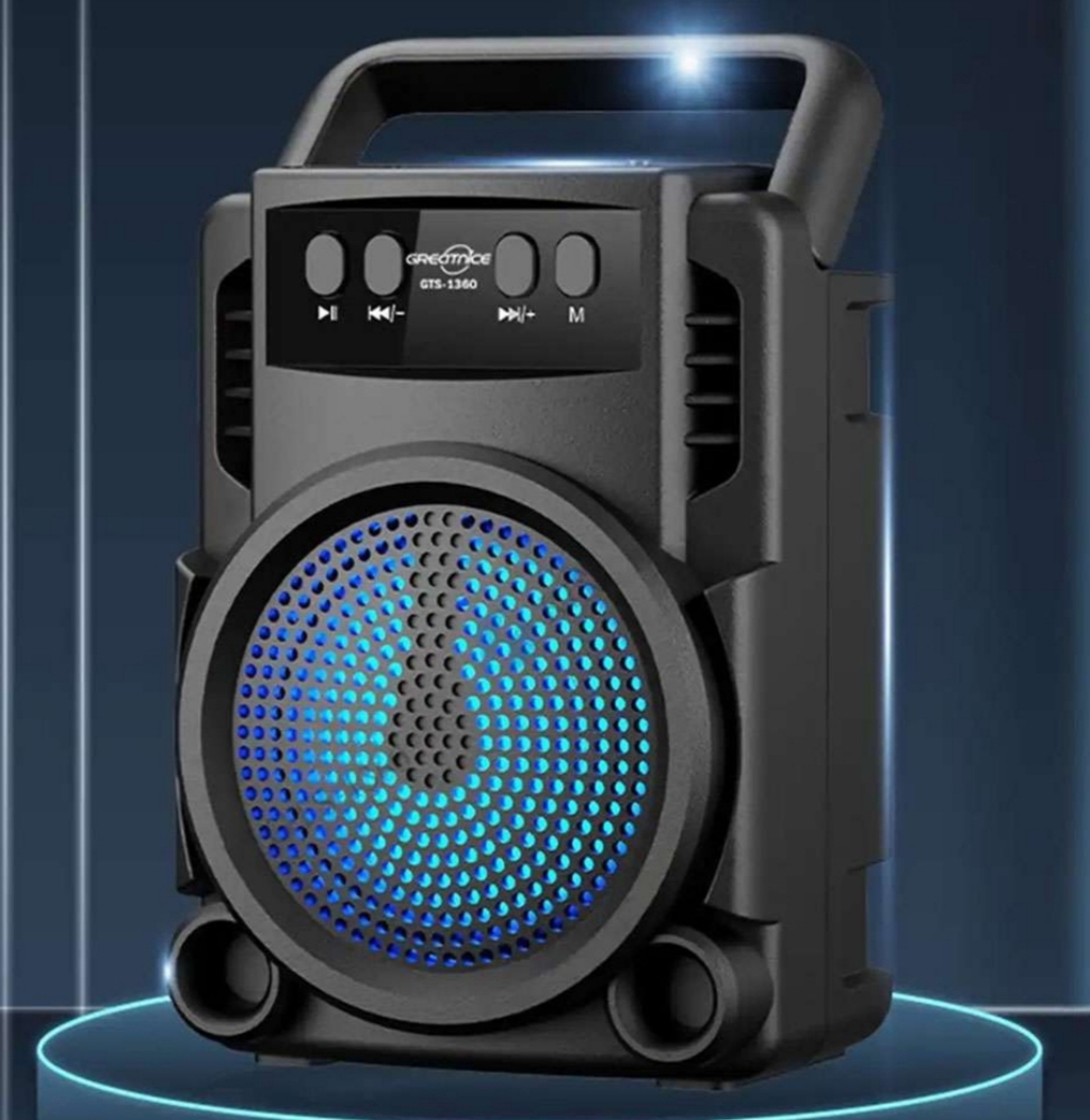 اسپیکر بلوتوثی قابل حمل GTS مدل 1360، مدت زمان پخش 8 ساعت نسخه بلوتوث 5 منبع انرژی باتری مدت زمان شارژ شدن 1 ساعت، همراه با کابل ،شارژ دارای درگاه USB و ورودی کارت حافظه دارای رقص نور میکروفون داخلی و پشتیبانی از رادیو